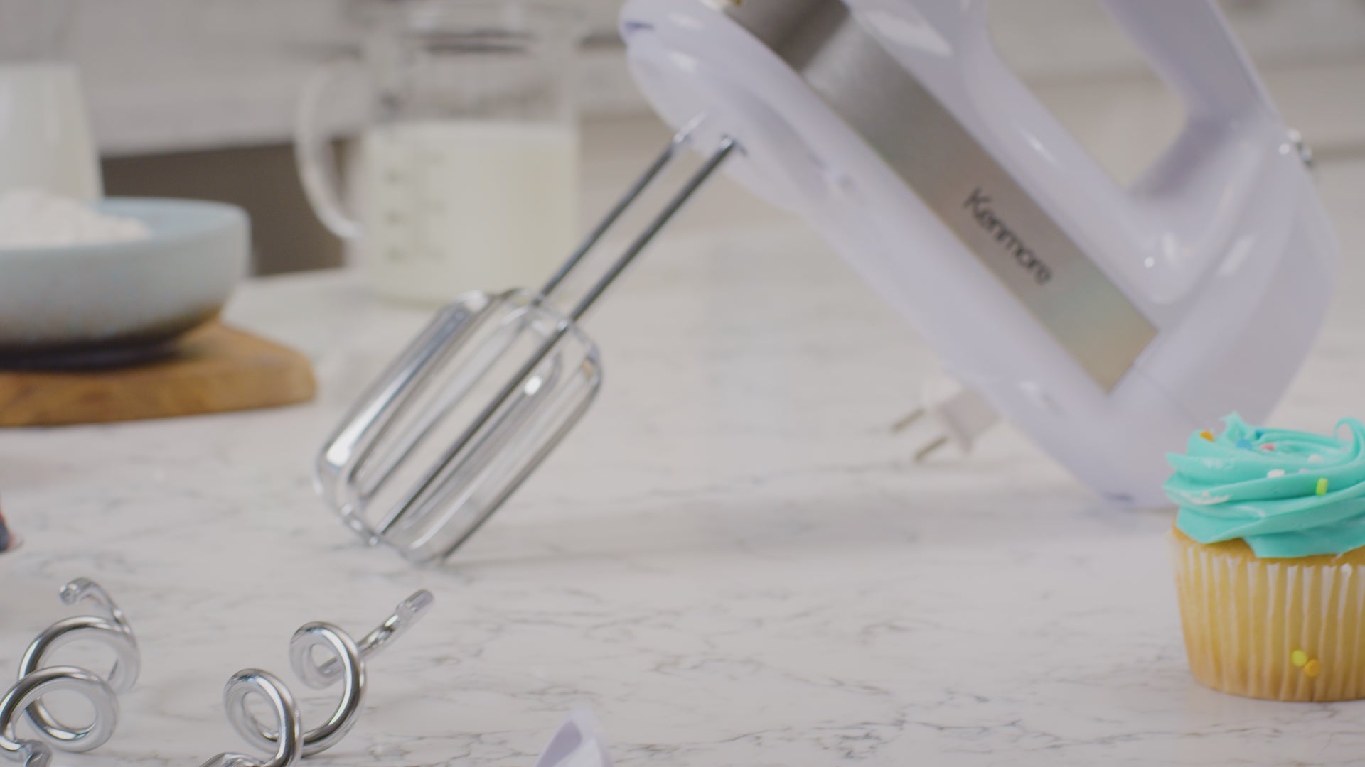 The Kenmore 5-Speed Hand Mixer / Beater / Blender is the perfect tool for the home baker. From whipping cream for dessert to whipping up a batch of chocolate chip cookies, this 250 Watt hand mixer has the power and accessories you need to tackle everyday jobs without pulling out your big stand mixer. This versatile hand mixer features 250 watts of power with burst control to give you an extra boost when you need it. This uniquely designed system includes interchangeable beaters, dough hooks, and a liquid blending rod to suit all your mixing needs, plus automatic power cord retraction and a clip-on accessory case for convenient all-in-one storage.