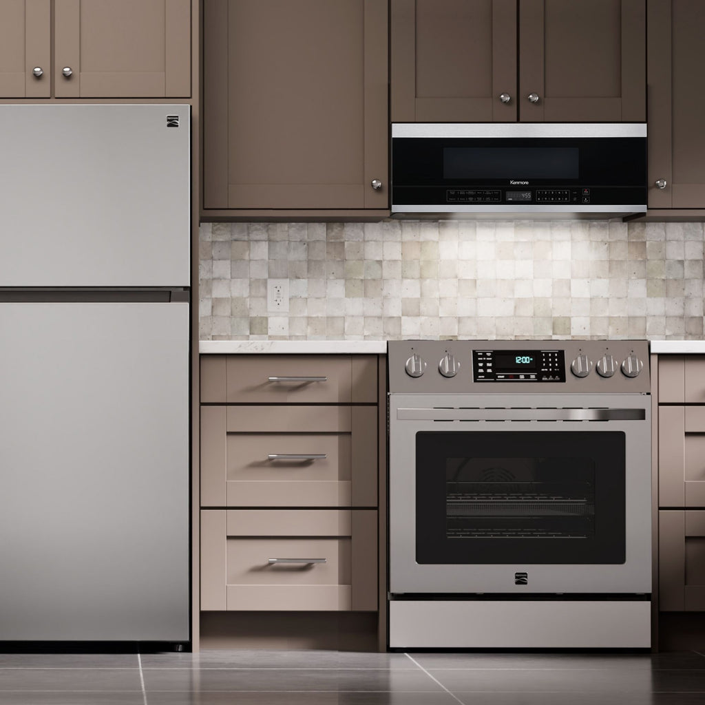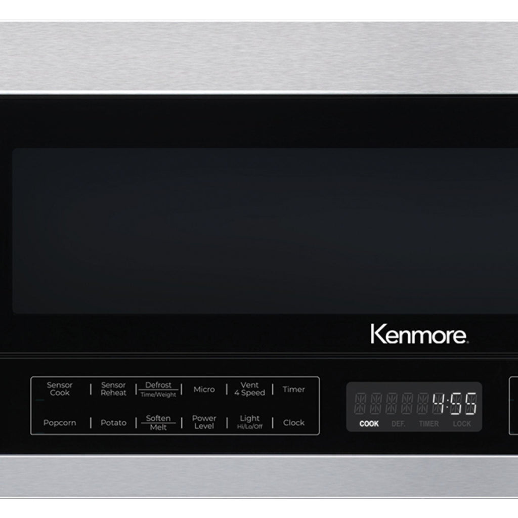 Kenmore's 1.2 cu ft over the range microwave blends sleek stainless steel with a slim, low profile design. Featuring 1000 watts of power with 15+ sensor cook and sensor reheat programs plus LED interior and cooktop lighting, this microwave delivers convenience and performance. The 4 speed, 400 CFM ventilating system with active charcoal filters and convertible venting keeps air fresh no matter what's cooking and the easy-clean cavity ensures hassle free maintenance.