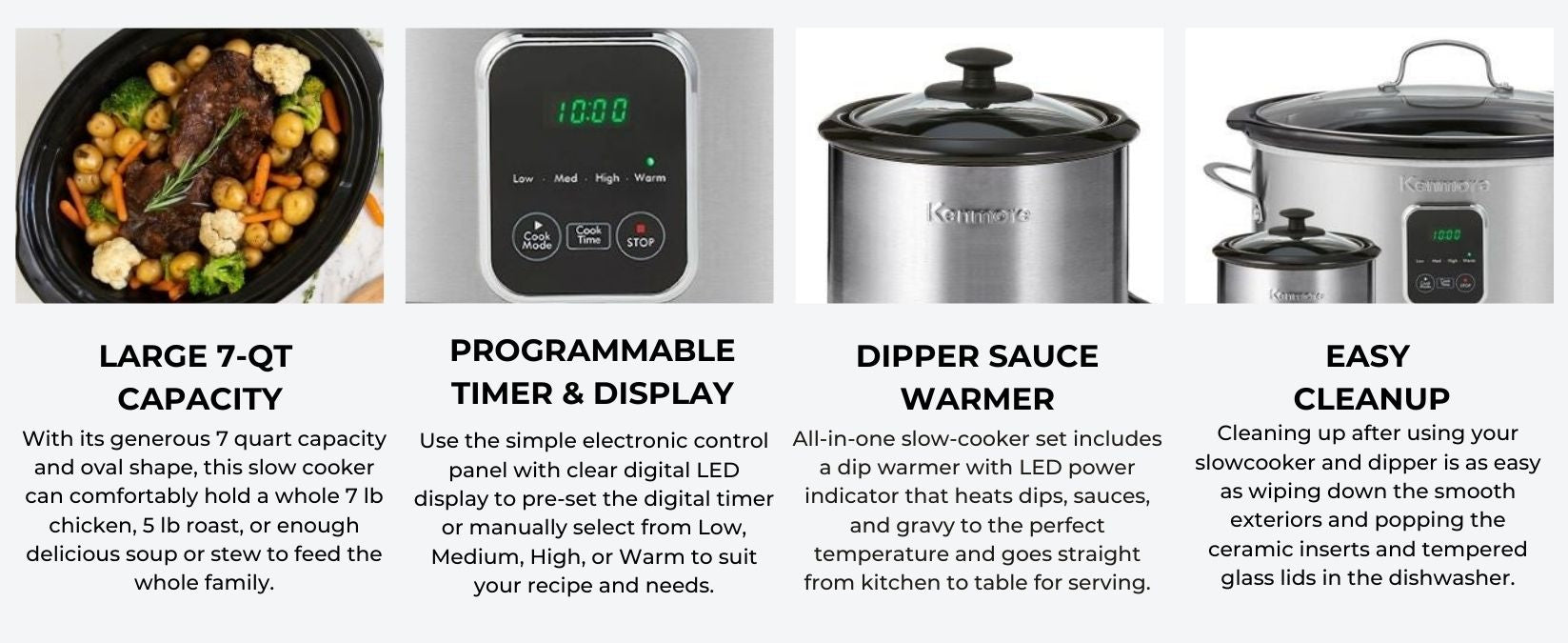 - Dipper for Sauces: All-in-one slow-cooker set includes a bonus dip warmer with LED power indicator that heats dips, sauces, and gravy to the perfect temperature and goes straight from kitchen to table for serving
