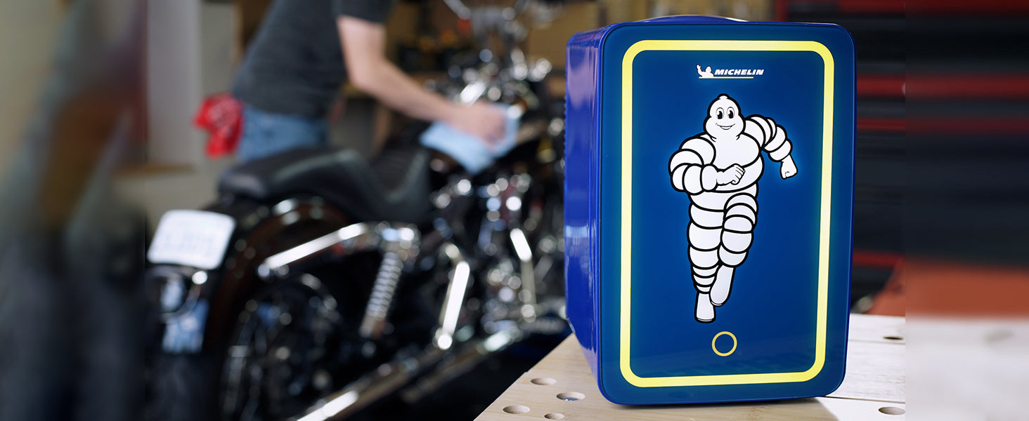 - Iconic Michelin Man Graphics: Licenced artwork featuring "Bibendum," better known as the Michelin Man, and eye-catching blue and yellow color scheme make this mini cooler perfect for collectors and automotive enthusiasts