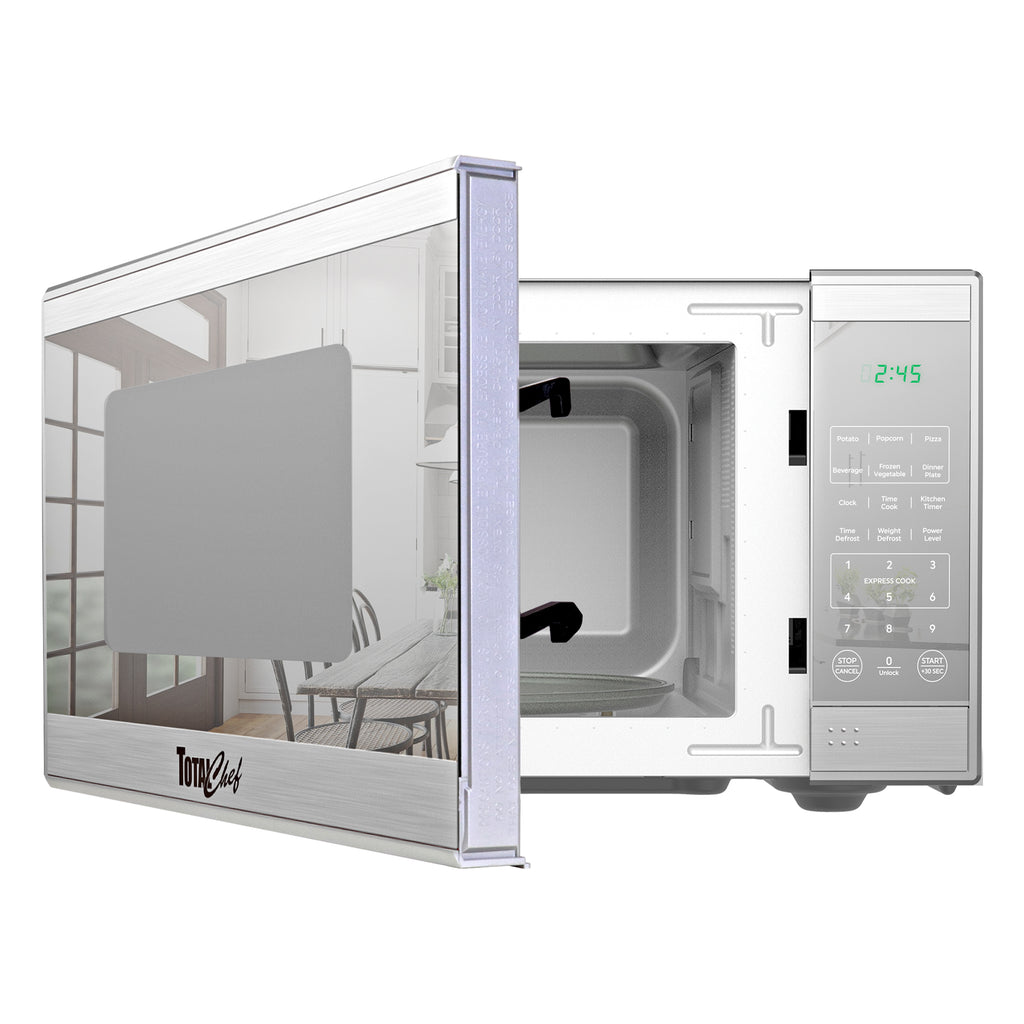 This compact and powerful 0.7 cu ft microwave is the perfect fit for college dorms, apartment kitchens, office lunch rooms, and much more. The 700W microwave features digital touch control, clear LED display, and a range of pre-set cooking modes including popcorn, potato, pizza, frozen vegetable, beverage, and reheat functions. It also has a kitchen timer, digital clock, defrost by weight or time, add 30 seconds, and 1-6 minute express cook options for extra convenience. Cleanup is quick and easy with a durable silver stainless steel exterior and white painted interior plus dishwasher-safe removable glass turntable and roller ring, making the Total Chef Compact Countertop Microwave Oven the ideal addition to any kitchen.
