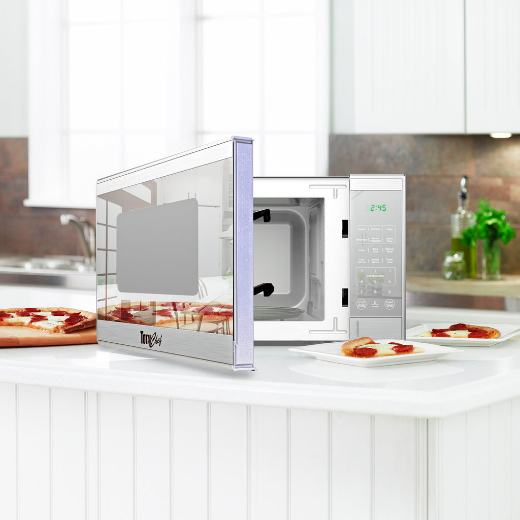 This compact and powerful 0.9 cu ft microwave is the perfect fit for college dorms, apartment kitchens, office lunch rooms, and much more. The 900W microwave features digital touch control, clear LED display, and a range of pre-set cooking modes including popcorn, potato, pizza, frozen vegetable, beverage, and reheat functions. It also has a kitchen timer, digital clock, defrost by weight or time, add 30 seconds, and 1-6 minute express cook options for extra convenience. Cleanup is quick and easy with a durable silver stainless steel exterior and white painted interior plus dishwasher-safe removable glass turntable and roller ring, making the Total Chef Compact Countertop Microwave Oven the ideal addition to any kitchen
